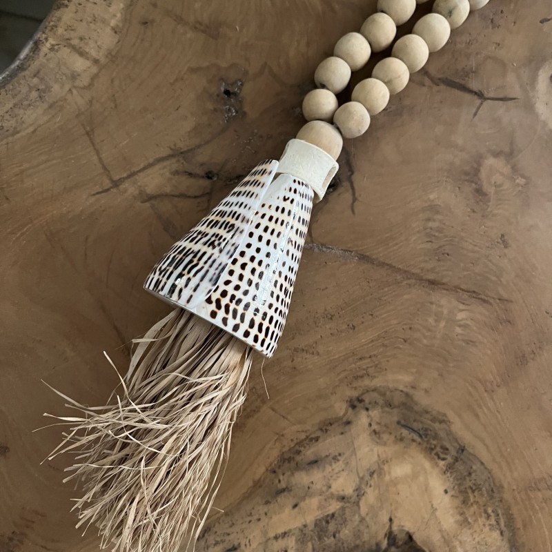 Apportez une touche naturelle et exotique avec cette embrasse avec un gros coquillage montés sur un collier de billes de bois. Sublimera vos rideaux ou suspendu à une porte d'armoire, poterie etc. Petite touche décorative unique et bohème chic.