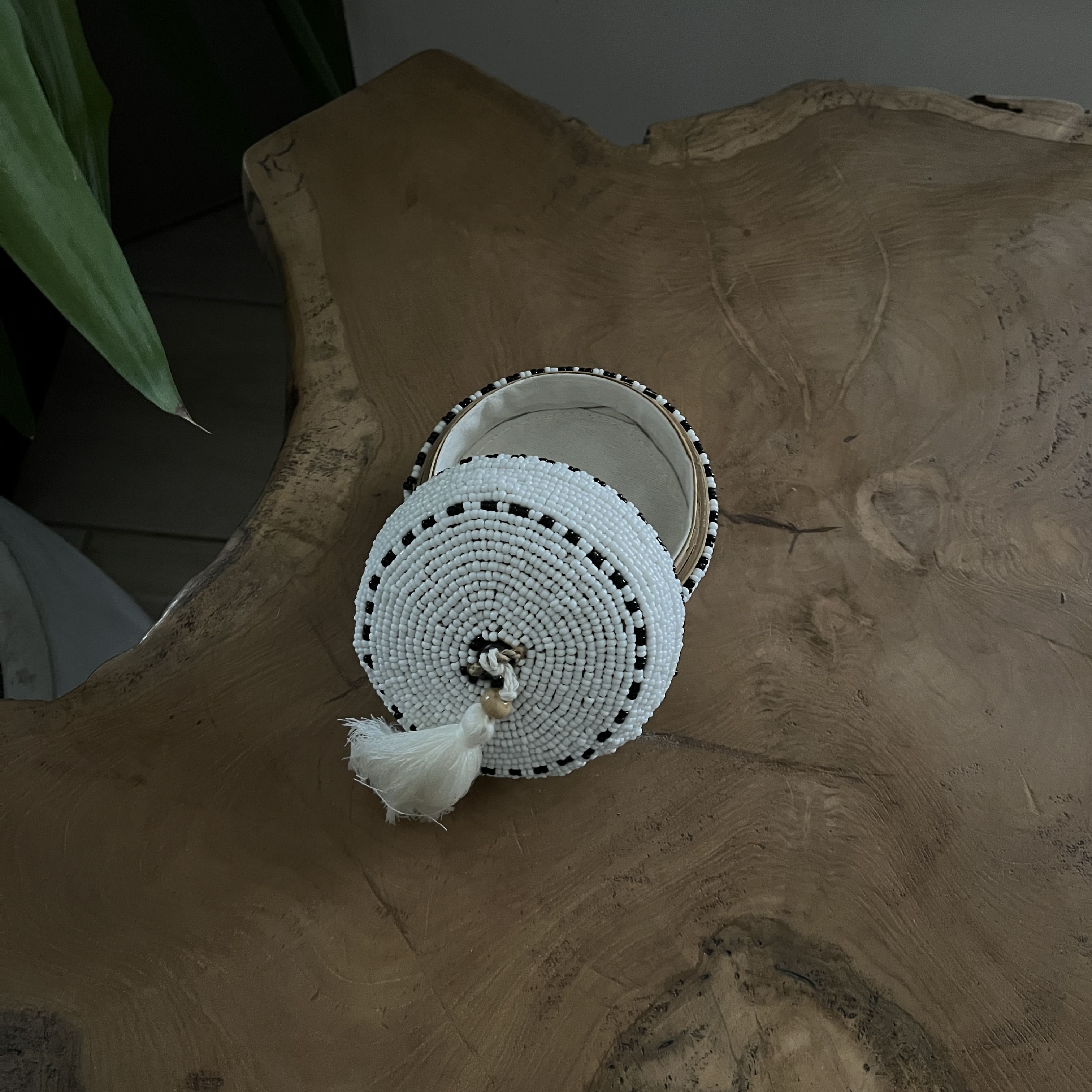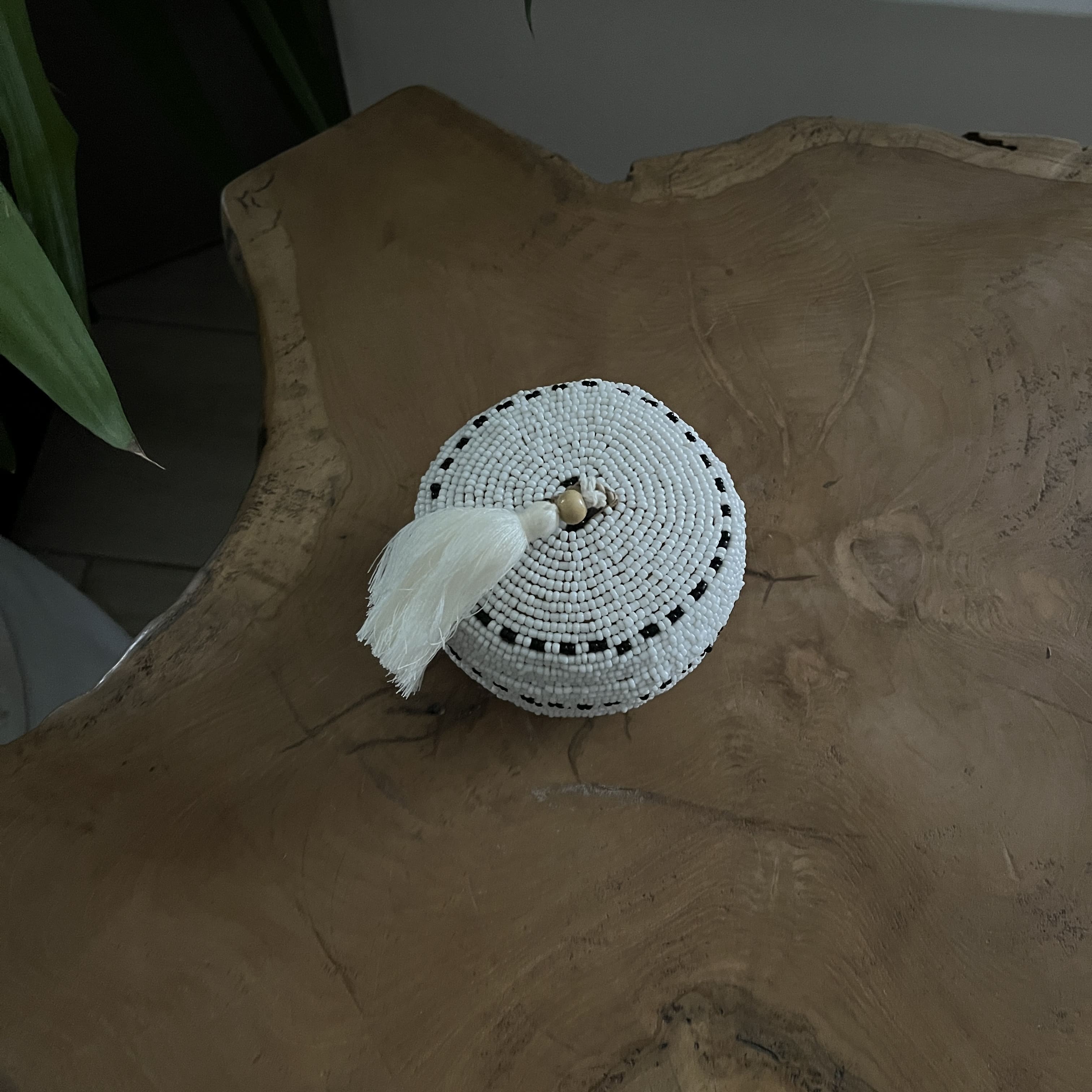 Magnifique boite XXS en bambou habillées de perles minutieusement tissées à la main.