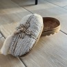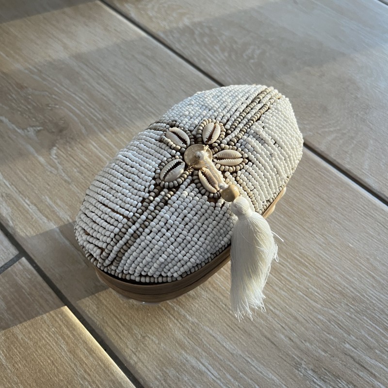 Magnifique boite XS en bambou ovale, habillée de perles et coquillages minutieusement tissés à la main.