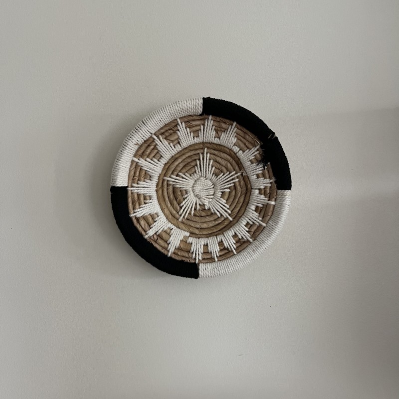 Suspension murale ronde en feuilles de bananier séchées et fil de coton blanc et noir