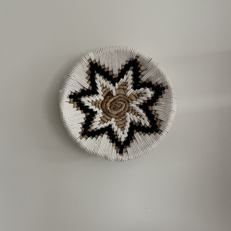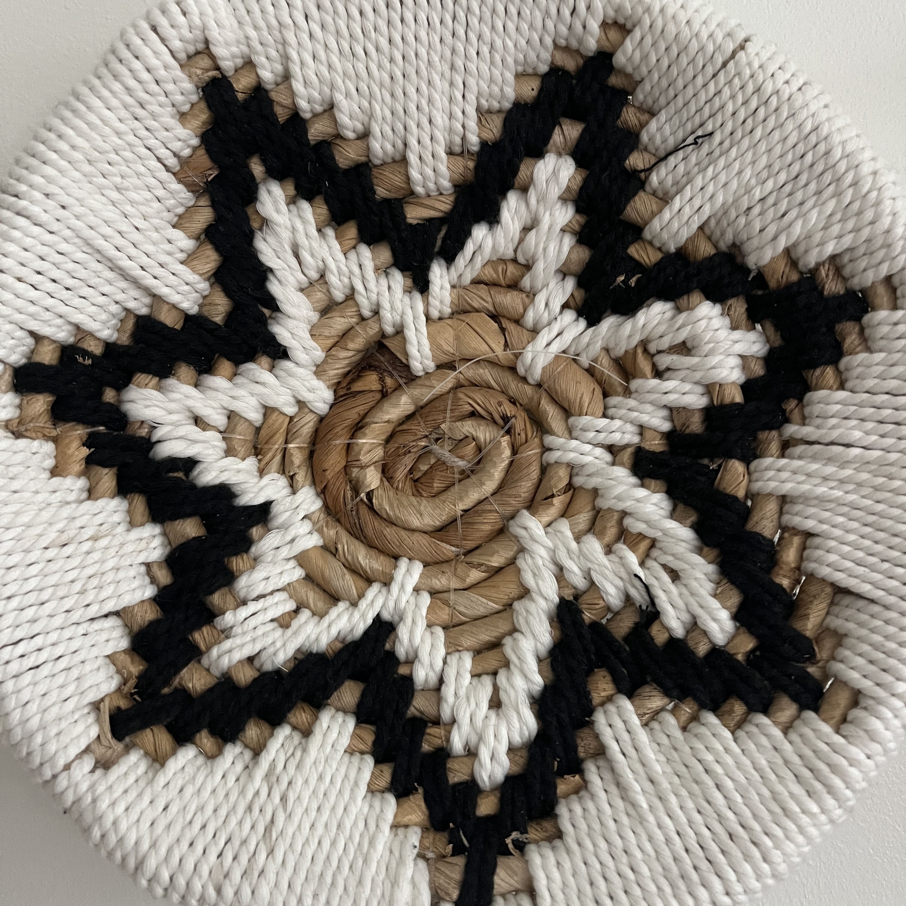Suspension murale ronde en feuilles de bananier séchées et fil de coton blanc et noir