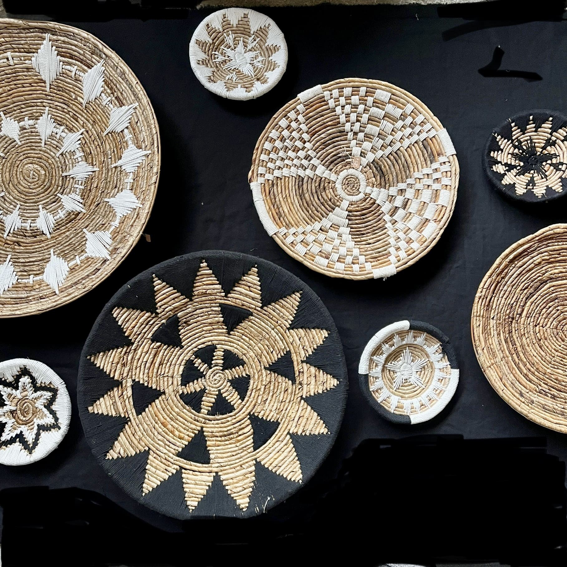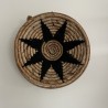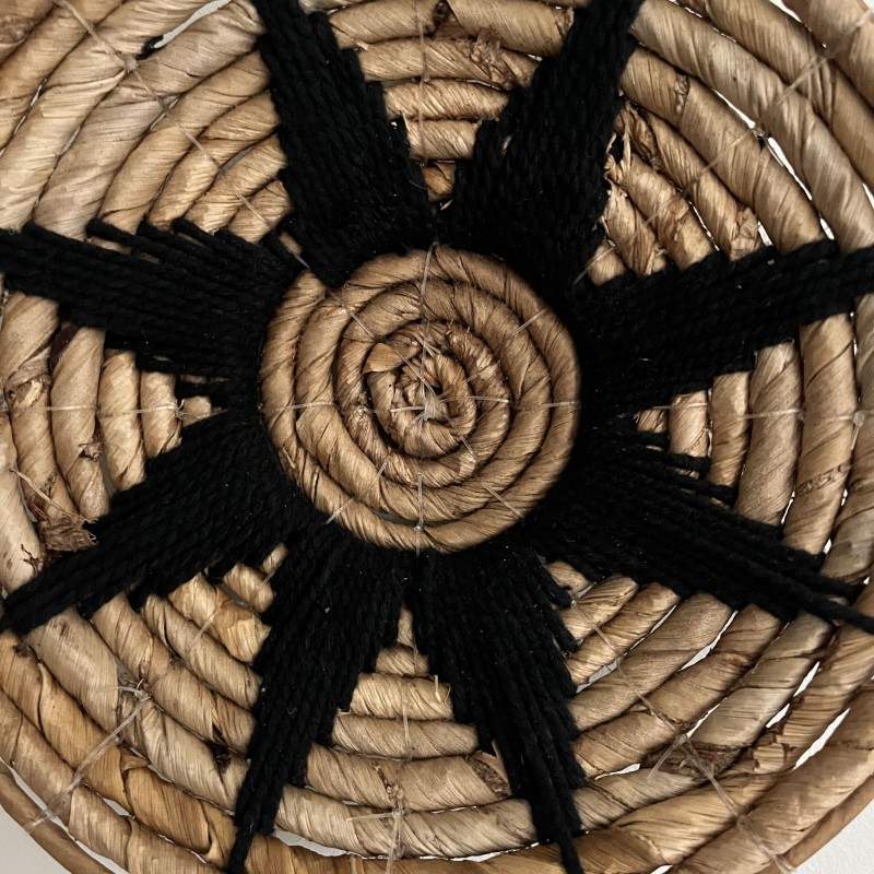 Suspension murale ronde en feuilles de bananier séchées et fil de coton noir.