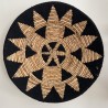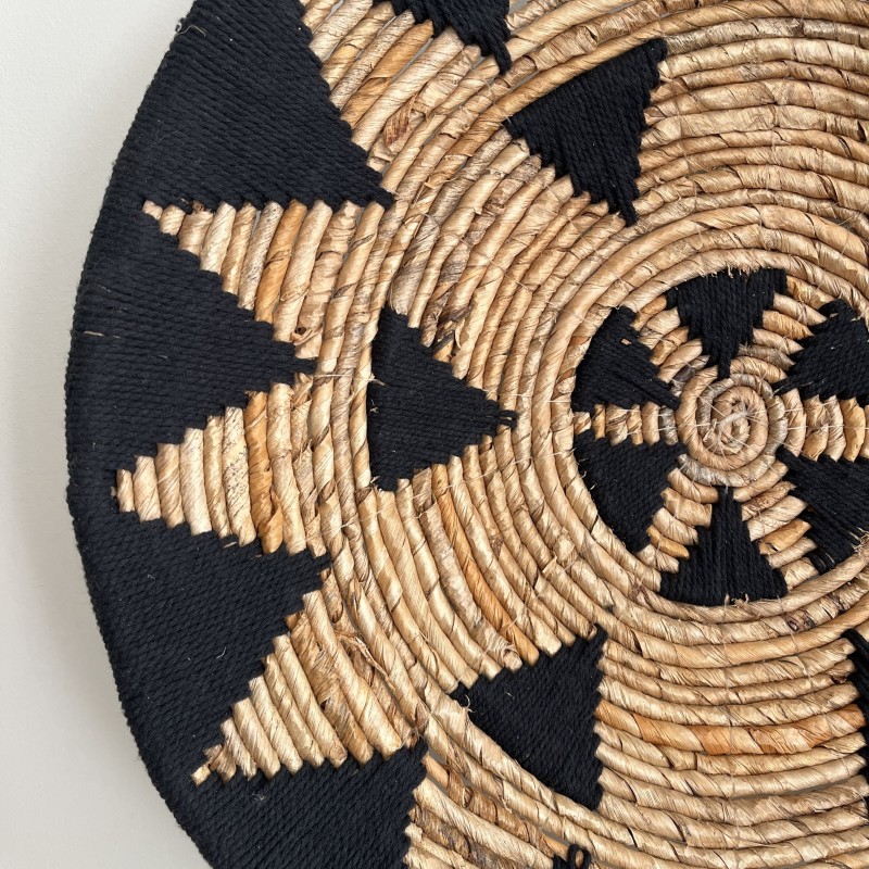 Suspension murale ronde en feuilles de bananier séchées et fil de coton noir.