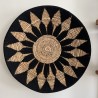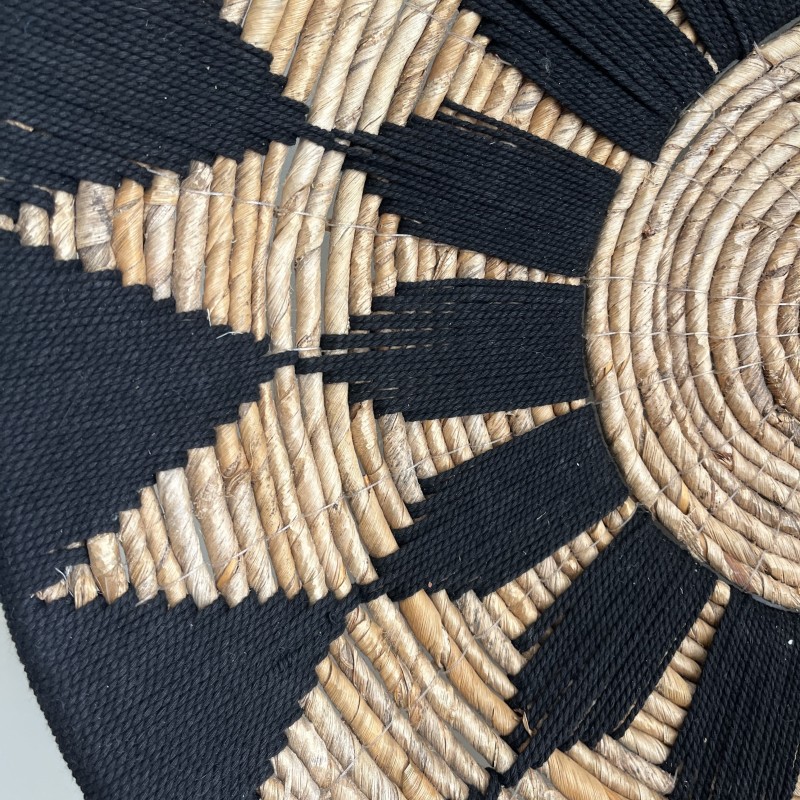 Suspension murale ronde en feuilles de bananier séchées et fil de coton noir.