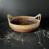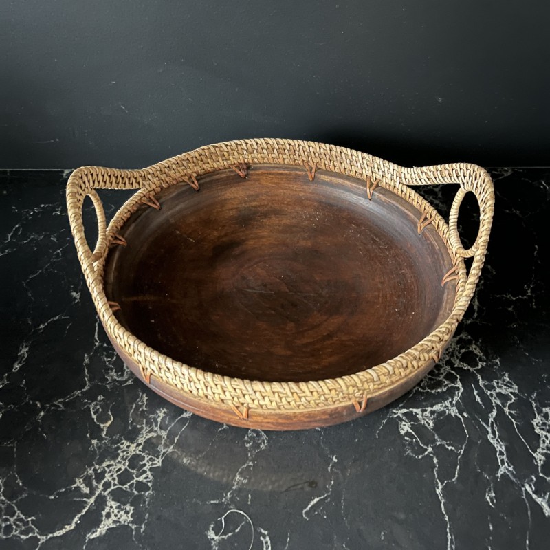 Corbeille ou plateau rond avec anses en bois et rotin, pour servir, présenter ou décorer.