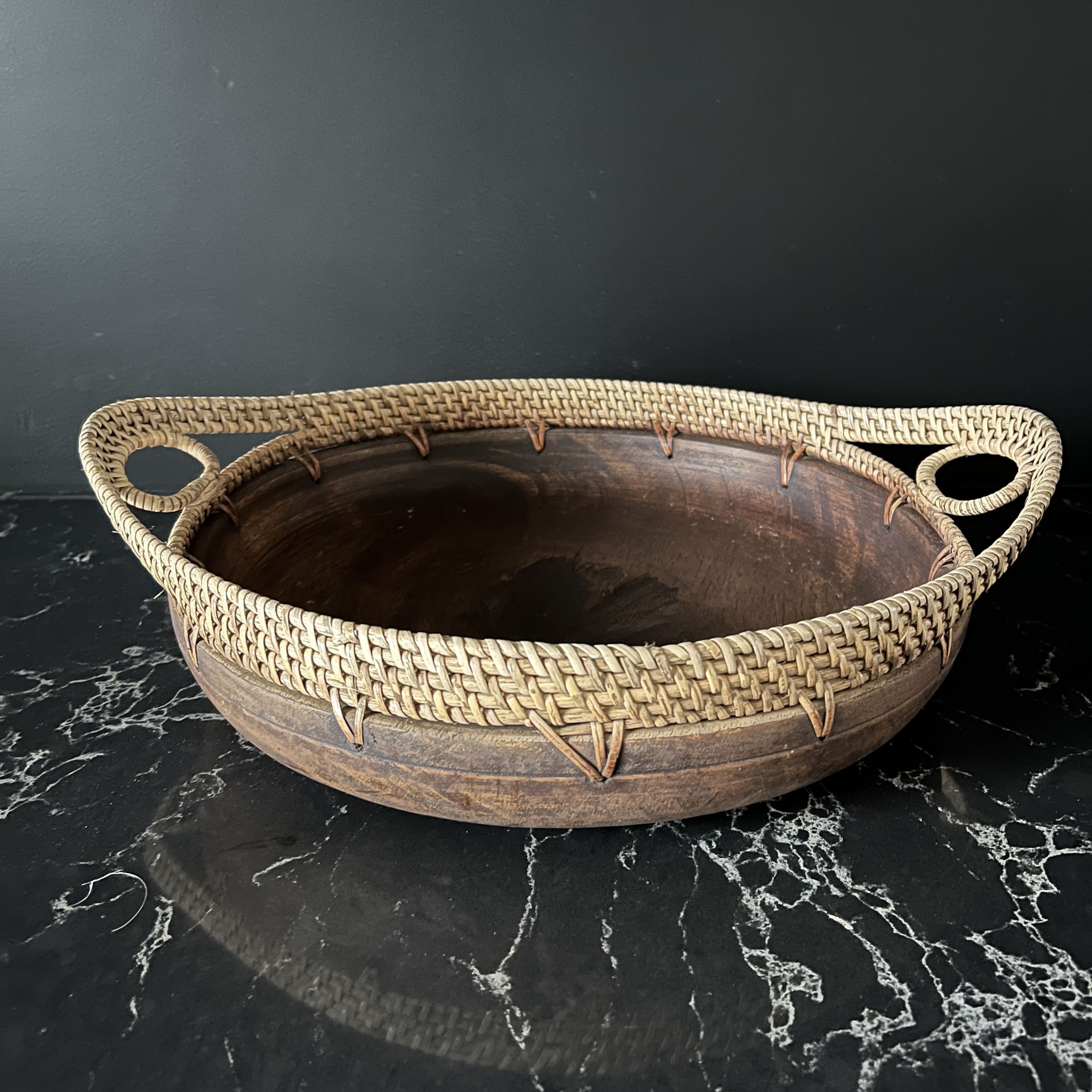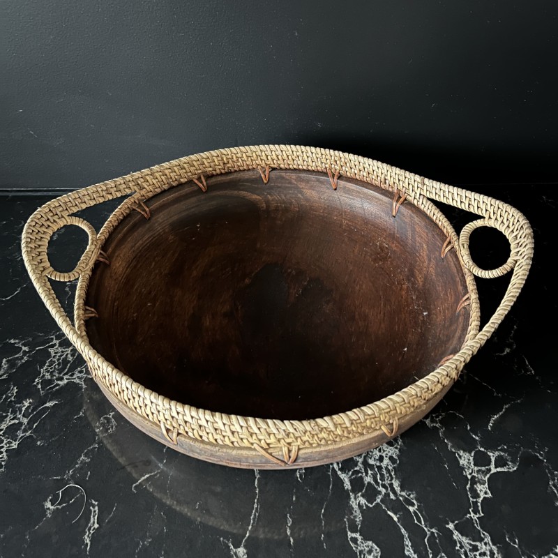 Corbeille ou plateau rond avec anses en bois et rotin, pour servir, présenter ou décorer.