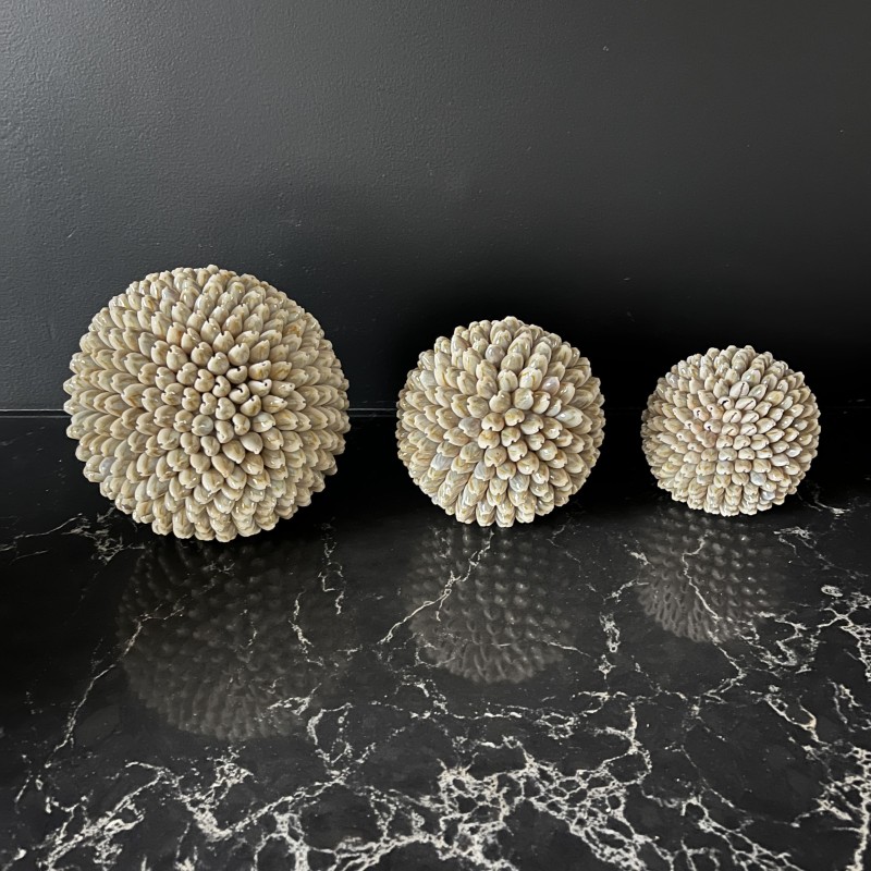 Boule en coquillages Cauri S de couleur grise, ils sont délicatement collés un à un par des doigts de fée très agiles.