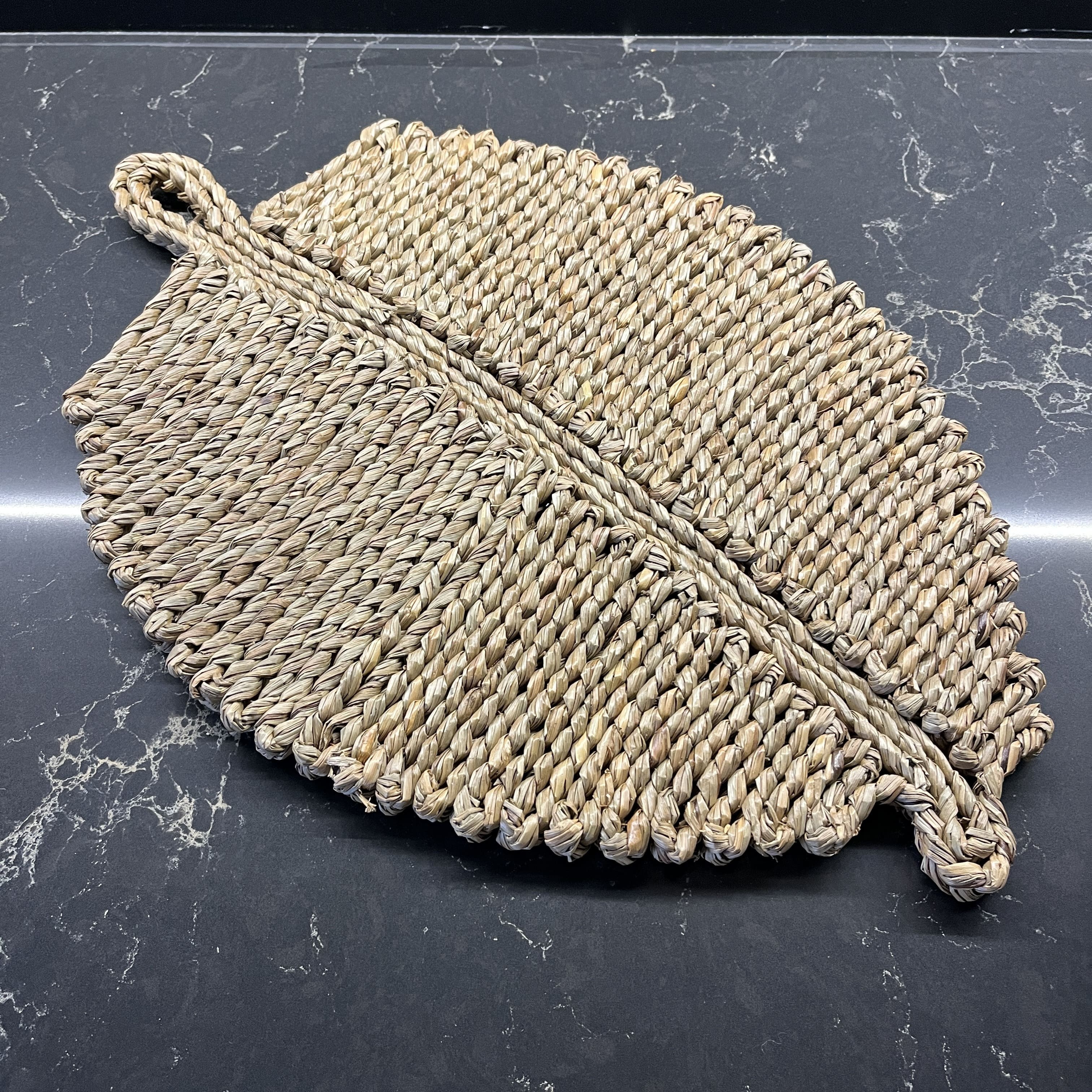 Dessous de plat en forme de feuille en jonc de mer tressé, il habillera et saura protéger votre table ou plan de travail avec naturel et élégance. Peut également se suspendre au mur