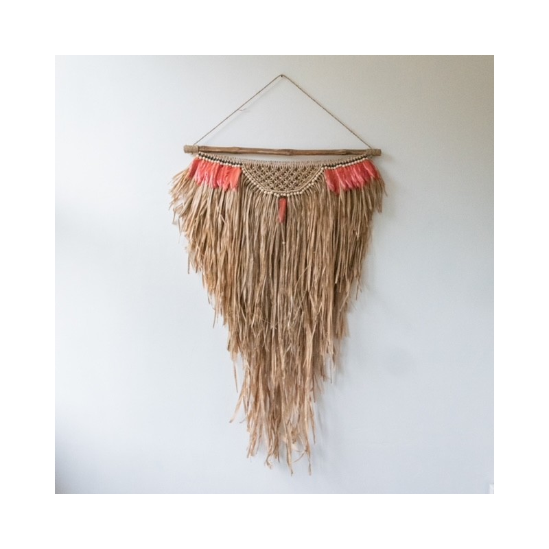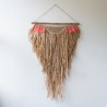 Suspension murale en bois flotté avec plumes orangée et billes de bois